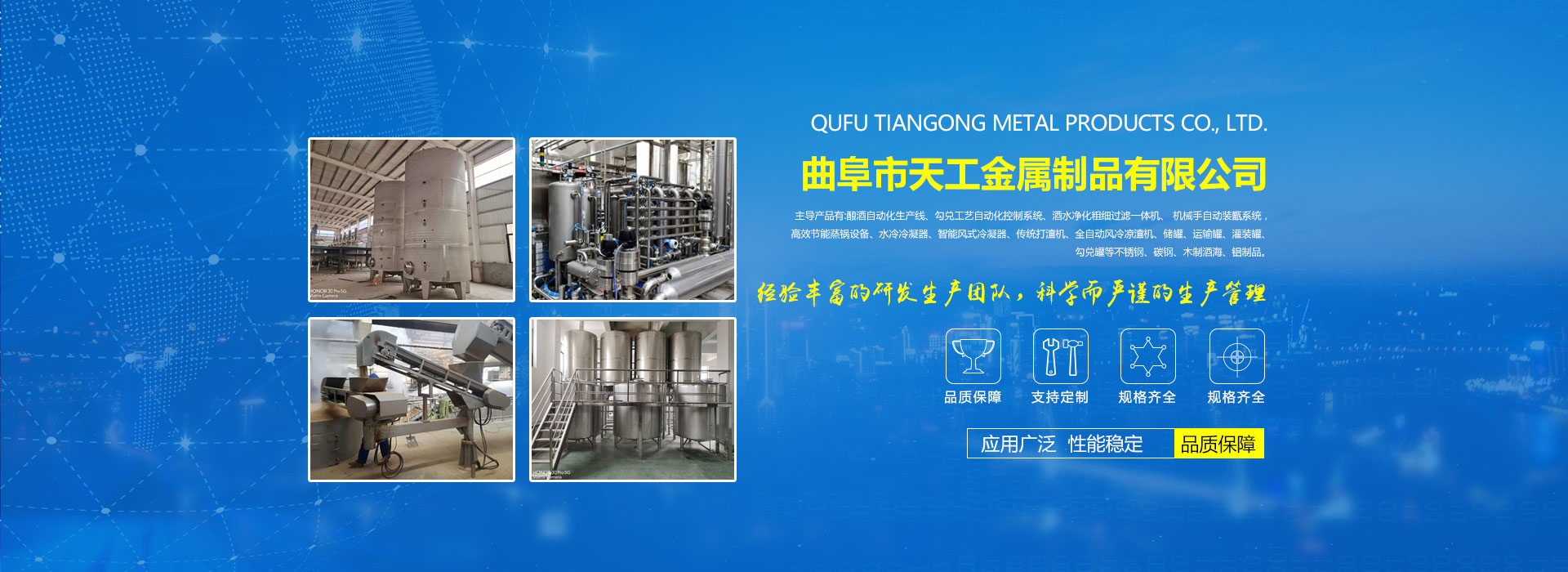公司擁有功能齊全的化驗室、試驗室,一支高水平的設計研發(fā)團隊。機械設備、激光切割機、激光焊接機、數(shù)控機床、數(shù)字加工中心,氬弧焊、電氣焊、等離子切割機一應俱全。技術力量雄厚,有釀造設備專家3名,工程師5名,大專學歷15名,中專學歷50名,員工全部持有由勞動技術部門,考核頒發(fā)的中級以上技術證書。公司配有嚴格的質量管理保證體系。通過了ISO9000質量體系認證,ISO9001質量管理體系認證,獲得多項國家發(fā)明專利和實用新型專利。